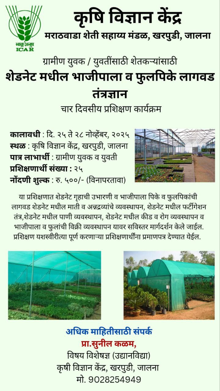 Training program on *Vegetable and Flower Cultivation Technology in Sheds* on 25 to 28 November, 2025 at Krishi Vigyan Kendra, Kharpudi, Jalna